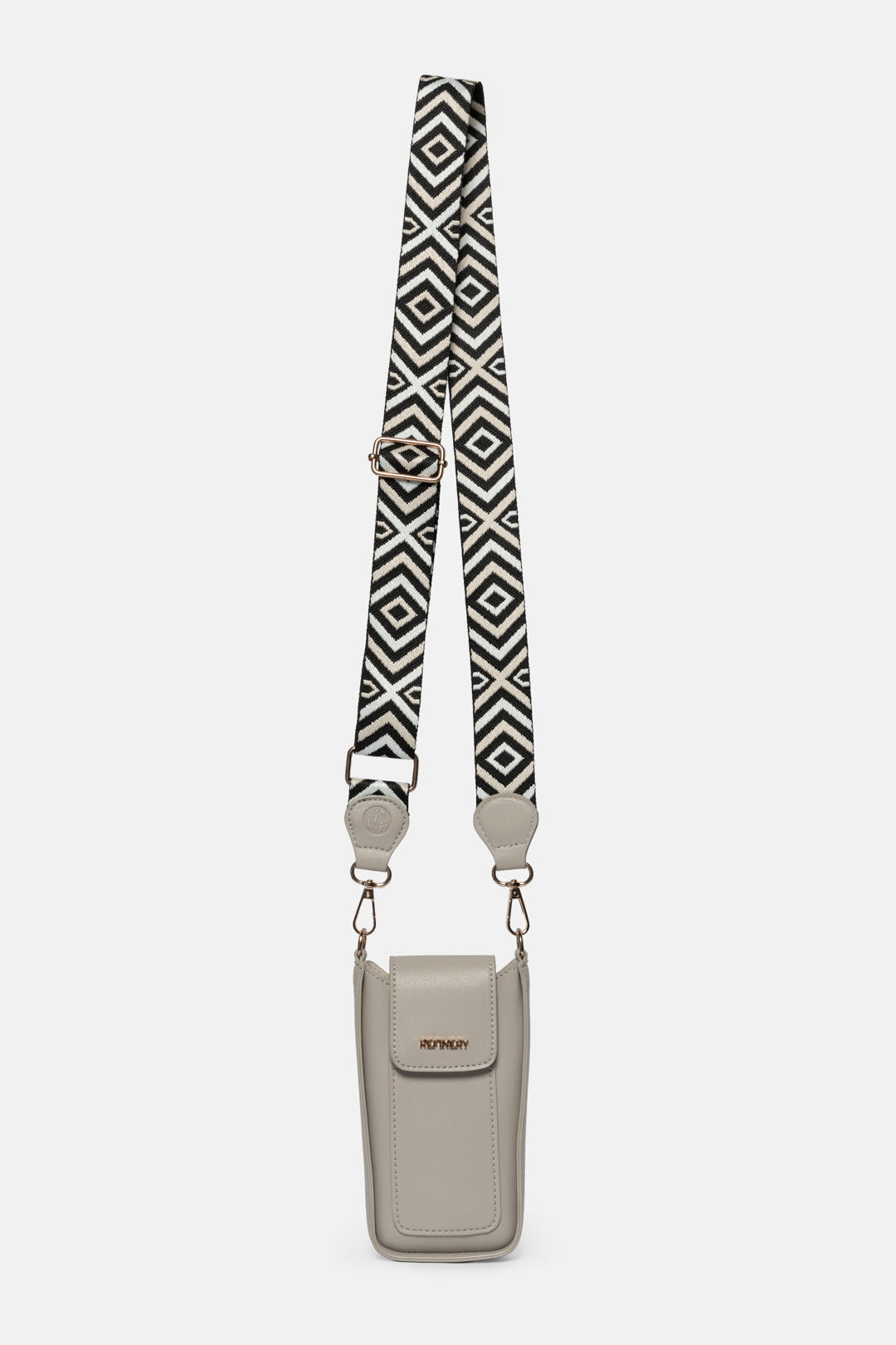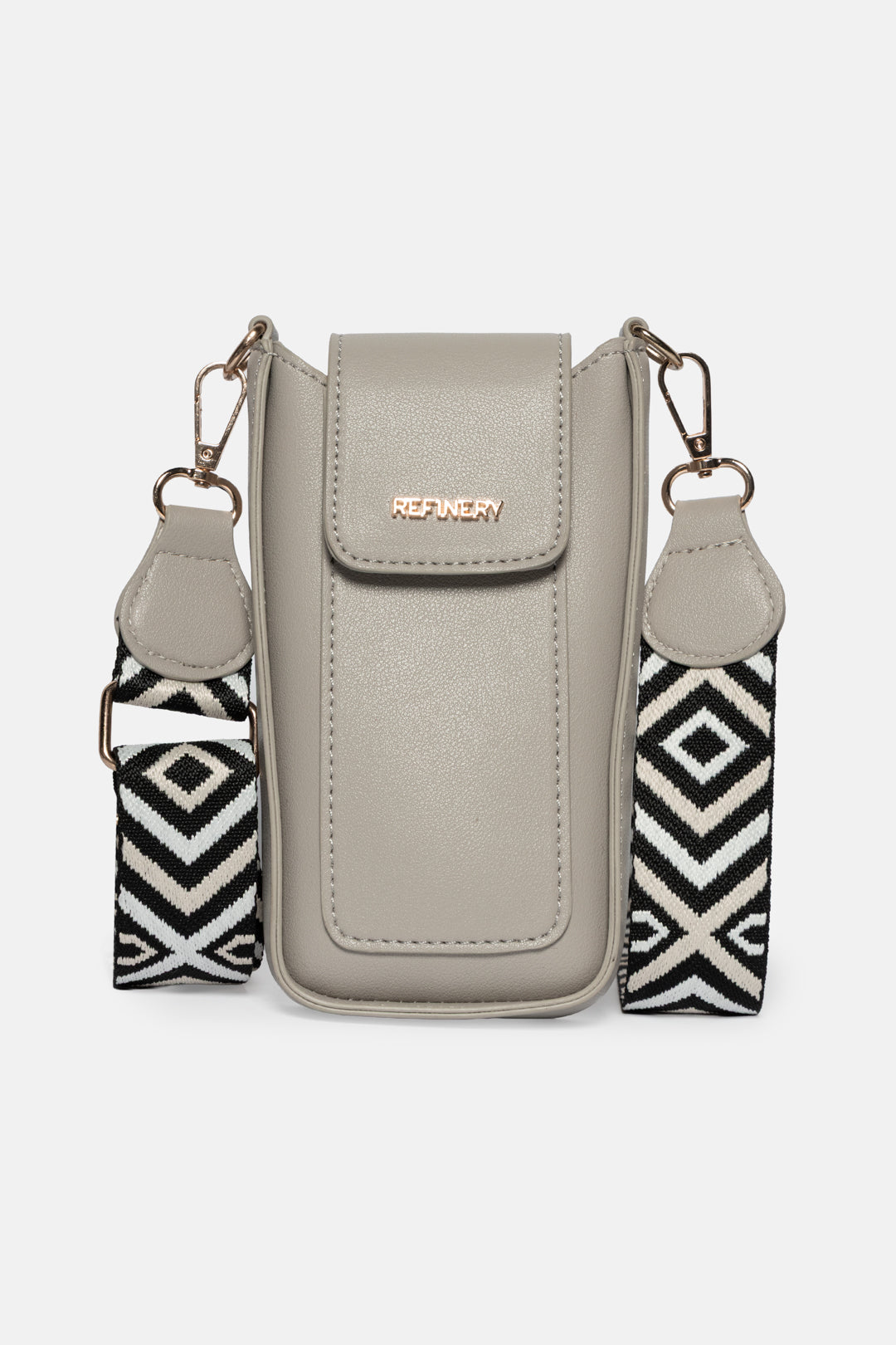 Grey cellphone bag with aztec webbing strap