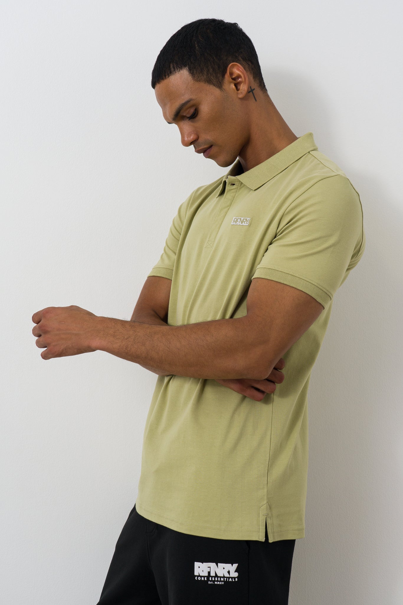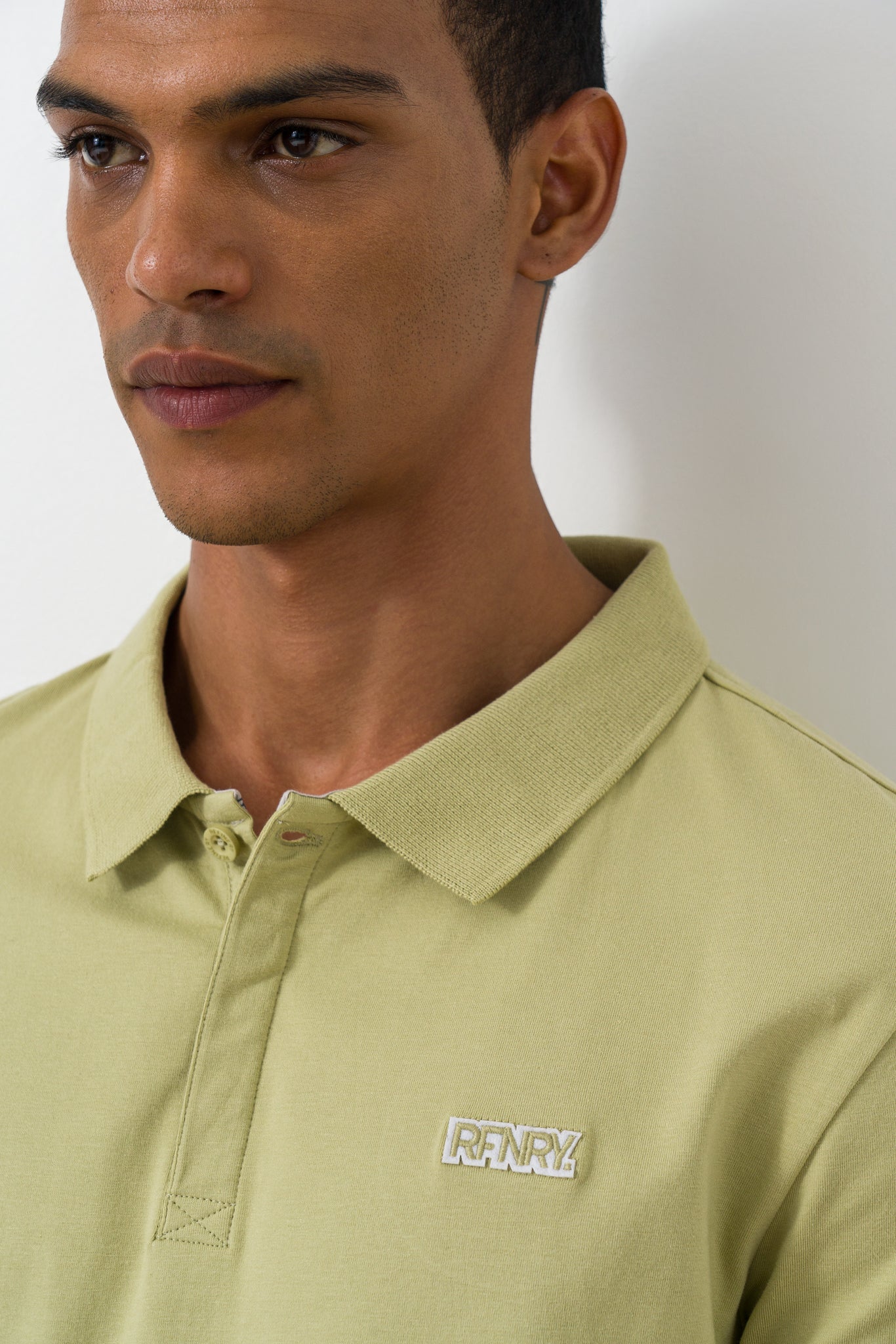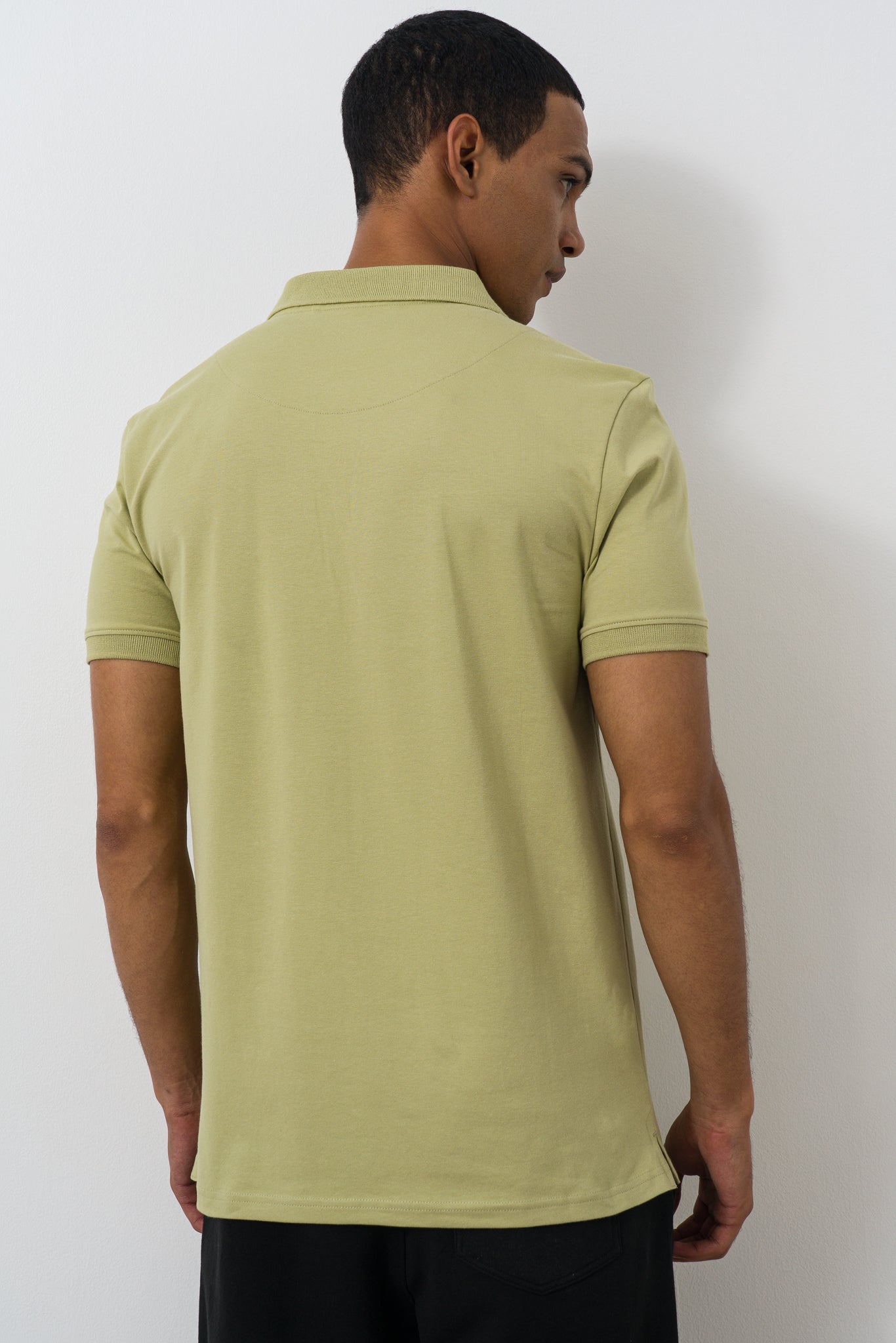 Sage single jersey golfer with branded buttons. The golfer has a branding application and special branded internal trims.