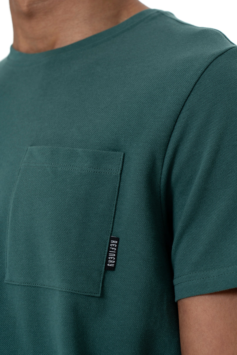 Green pique crew neck branded tee with pocket.