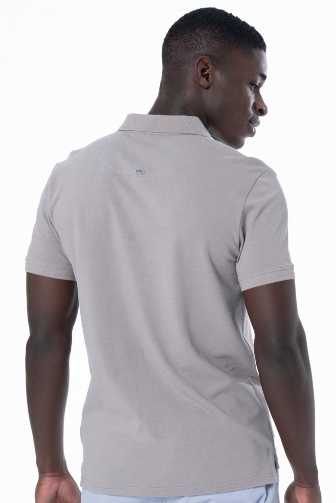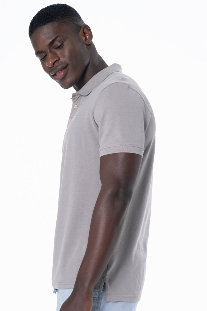 Grey golfer with branded wooden buttons. The golfer has a high density chest print, a step hem and special branded internal trims.