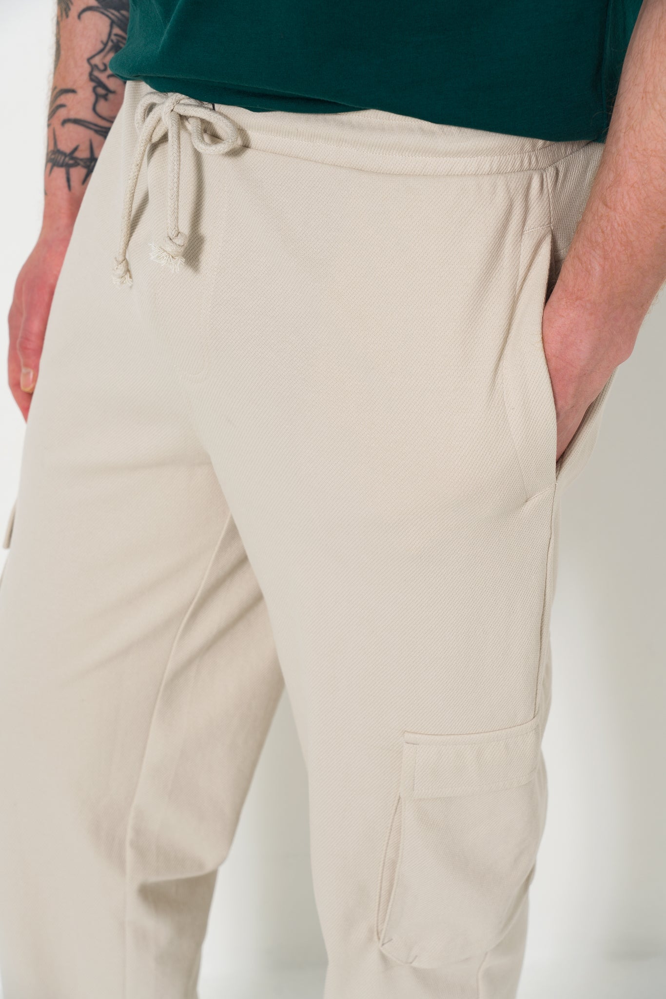 The stone pants combine effortless style with comfort, featuring an elasticated drawstring waistband for easy wear. They are designed with functional side entry pockets, cargo pockets, and a practical elasticated waistband with a functional drawcord. Crafted from a durable blend of 72% cotton and 28% polyester.