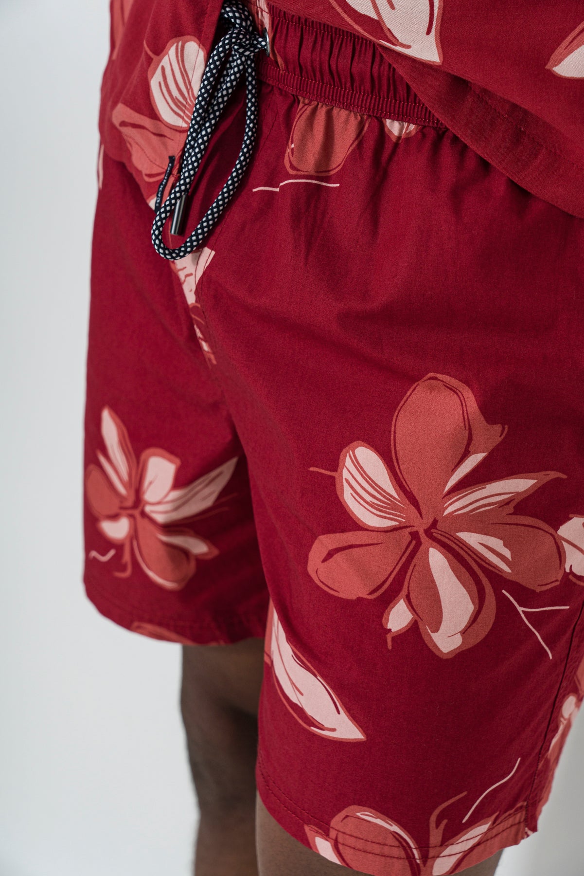 The red floral printed pool short is your perfect poolside essential. It has an elastic waistband that makes it easy to wear and comfortable.