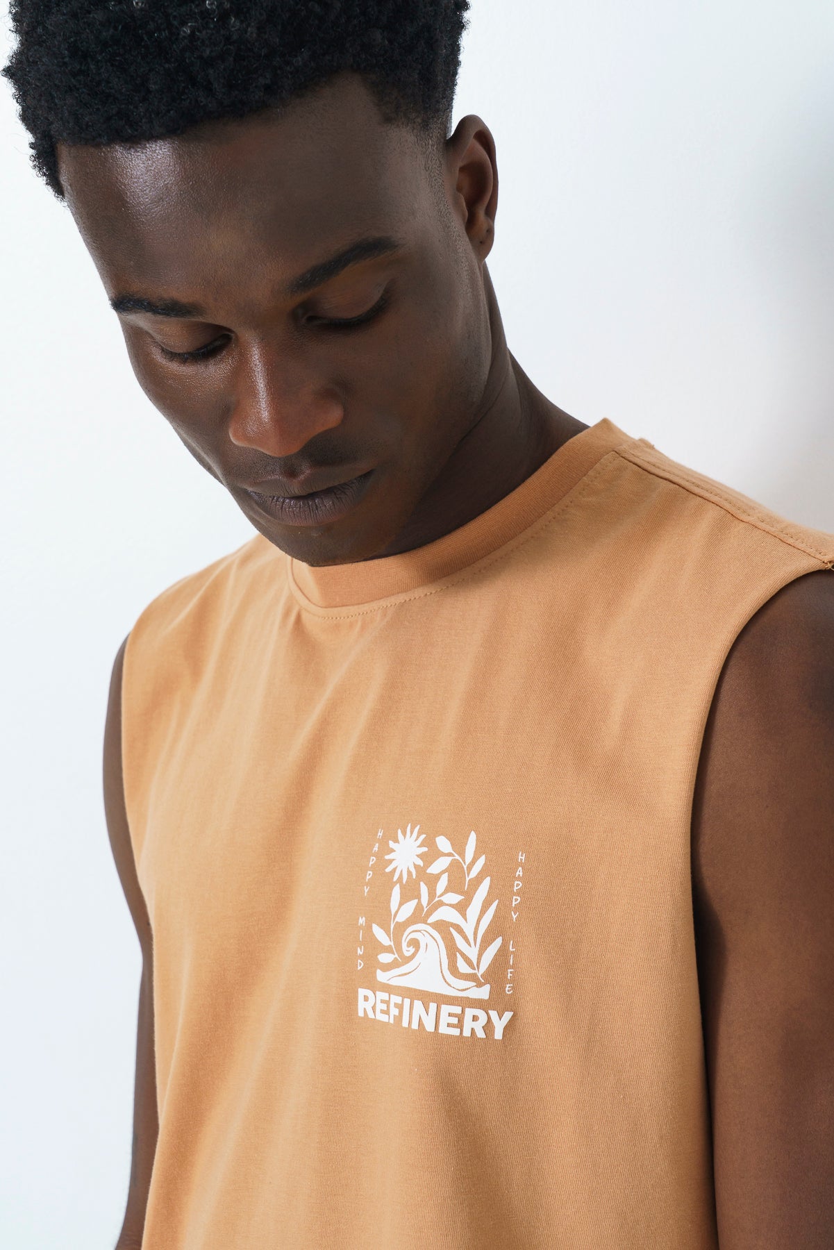 Toffee sleeveless tee with front and back print.