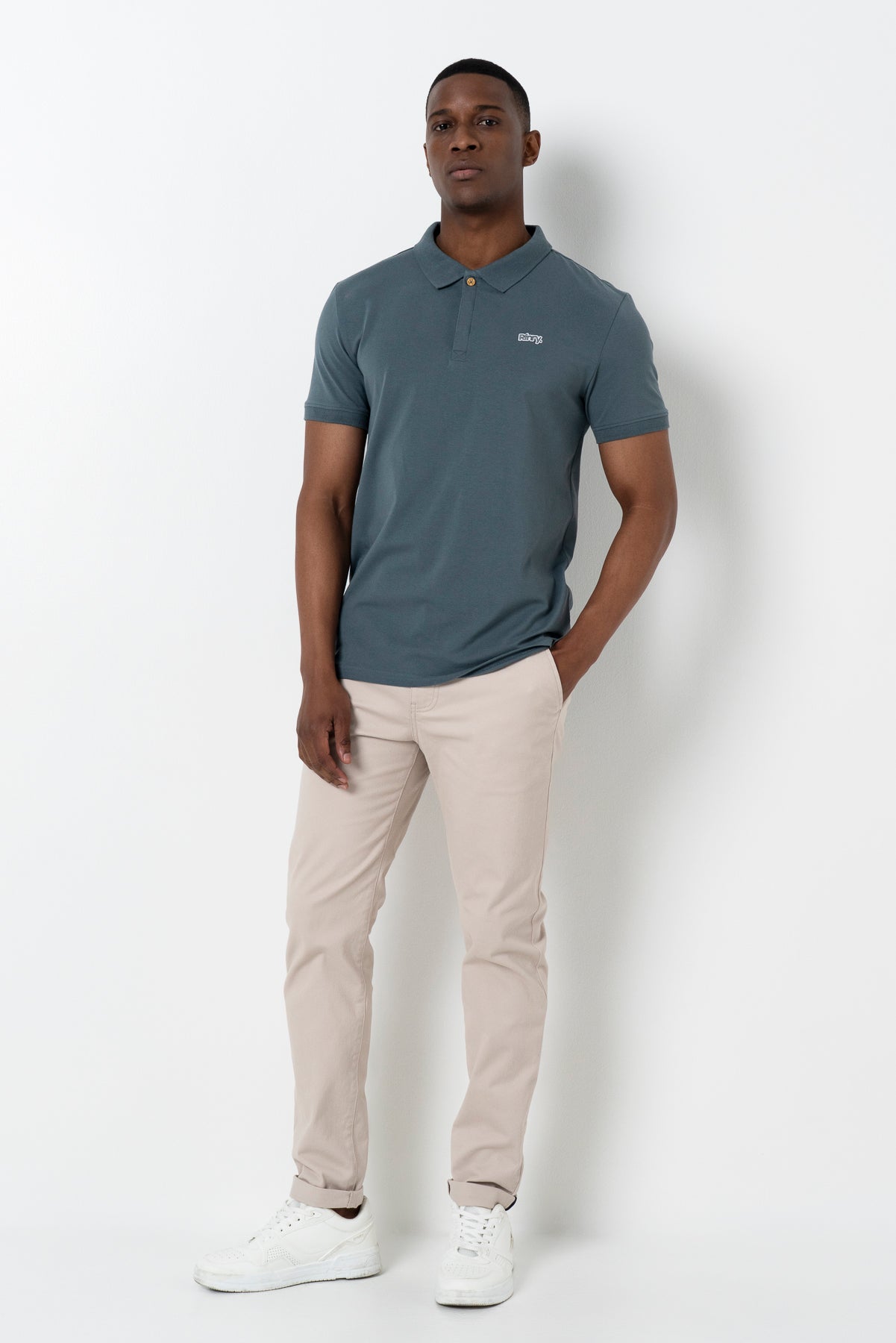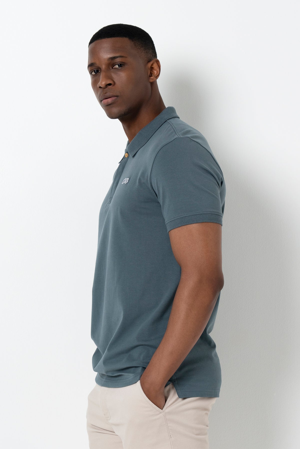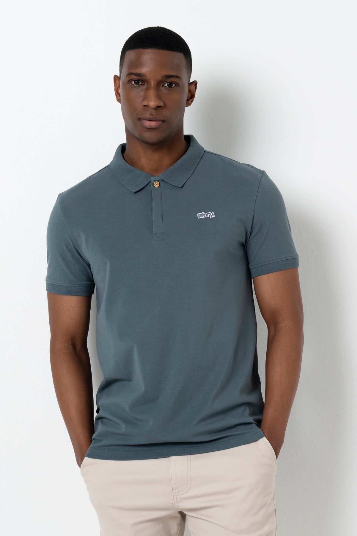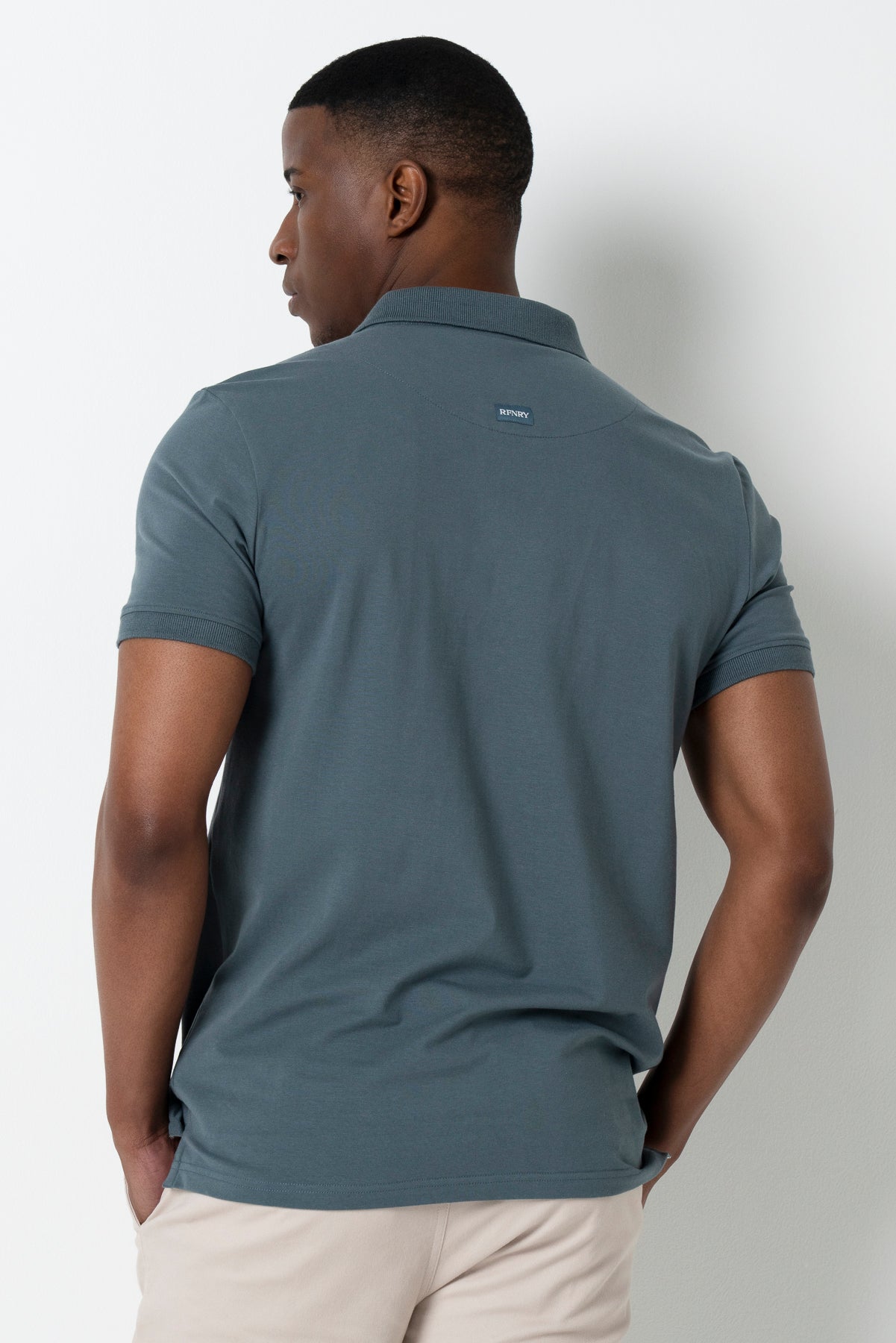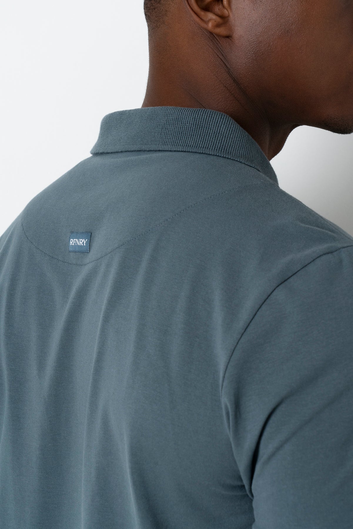 Petrol single jersey golfer with branded wooden buttons. The golfer has a branding application and special branded internal trims.