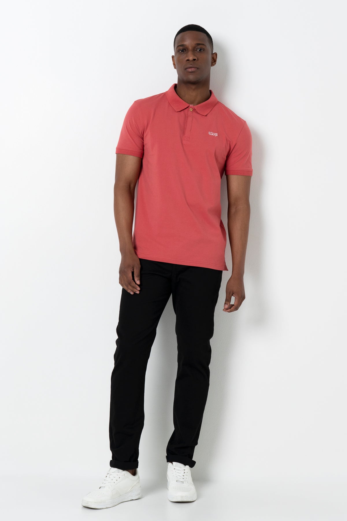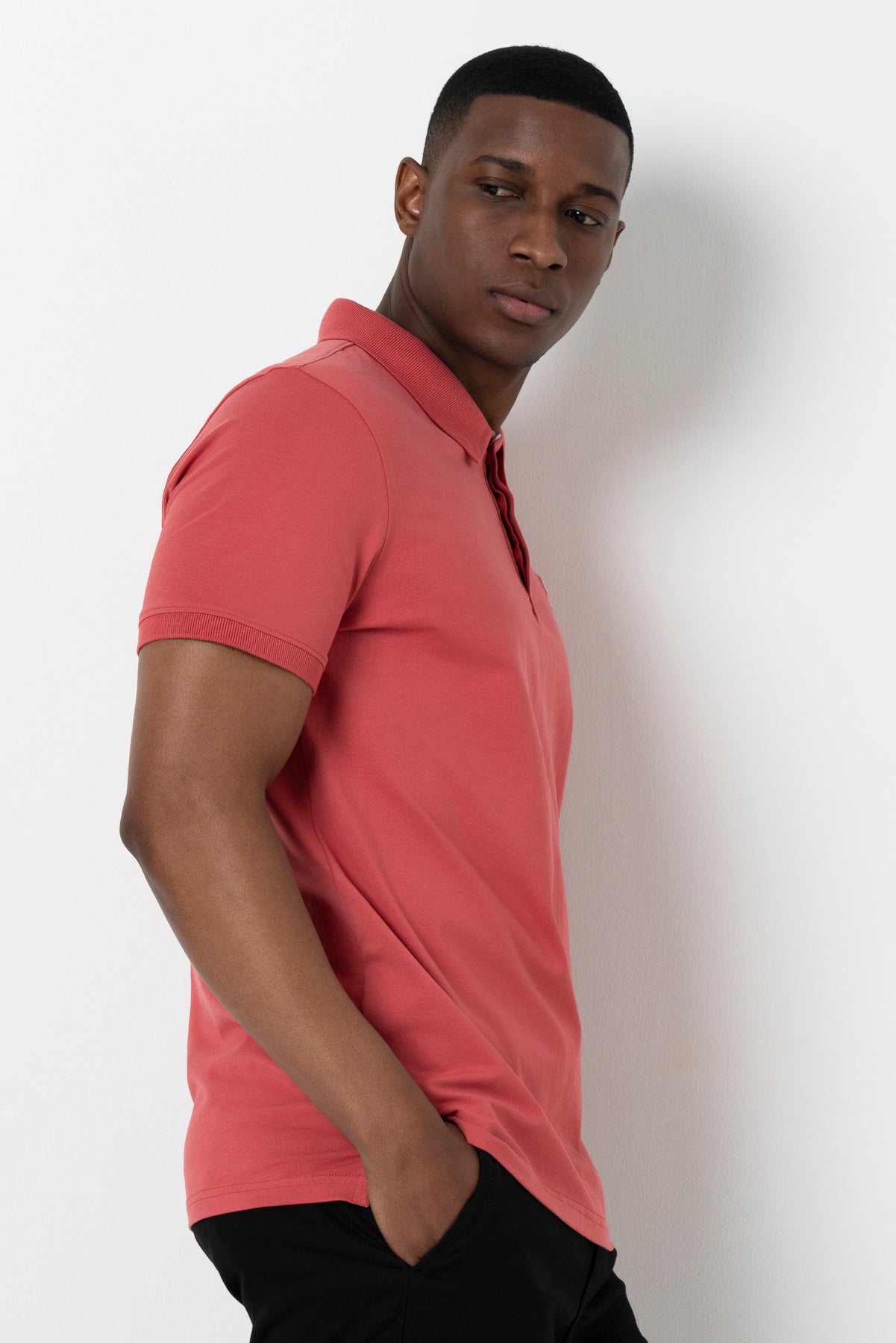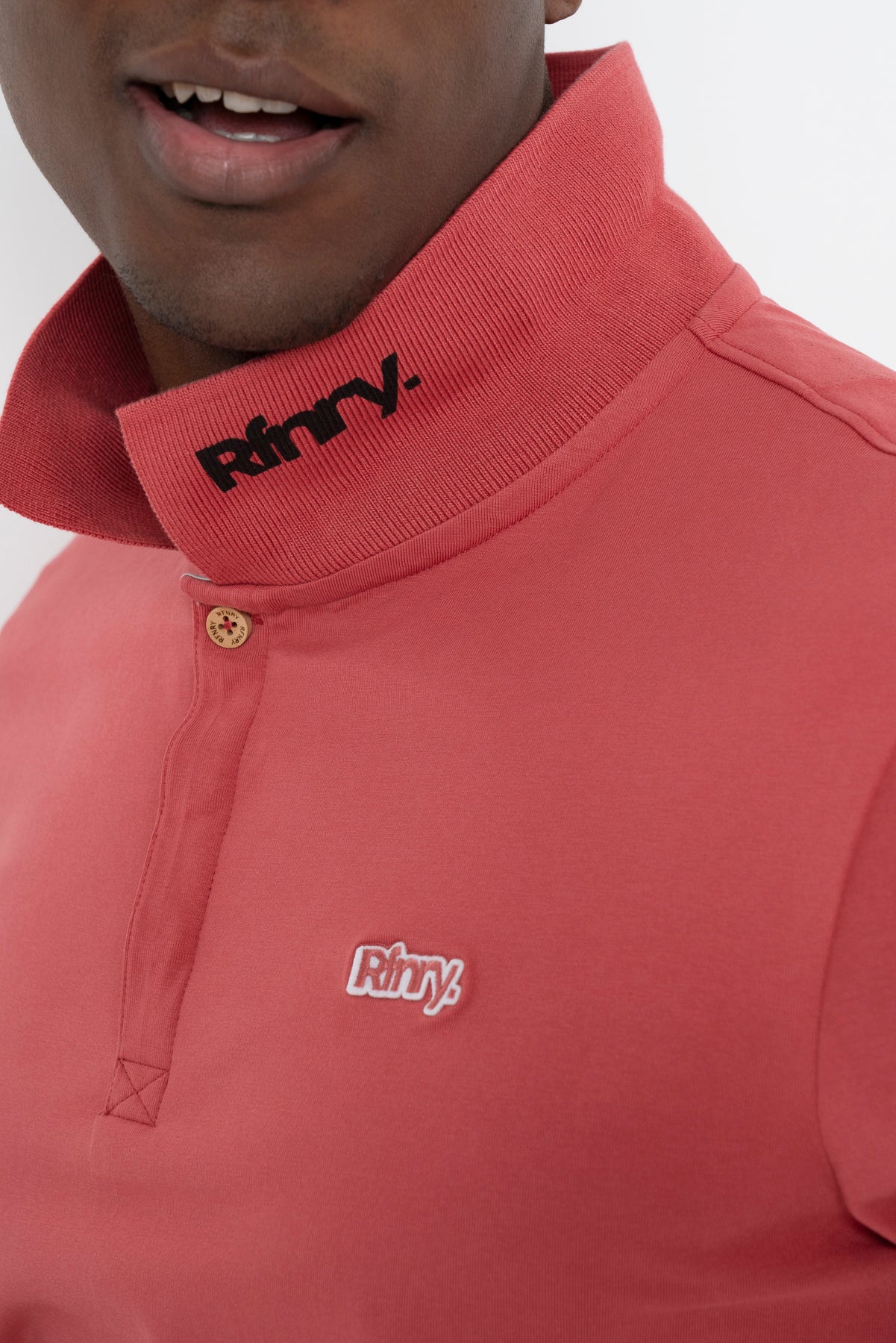 Red single jersey golfer with branded wooden buttons. The golfer has a branding application and special branded internal trims.
