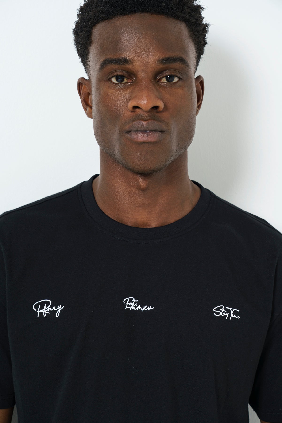 Black crew neck t-shirt with branded chest print.