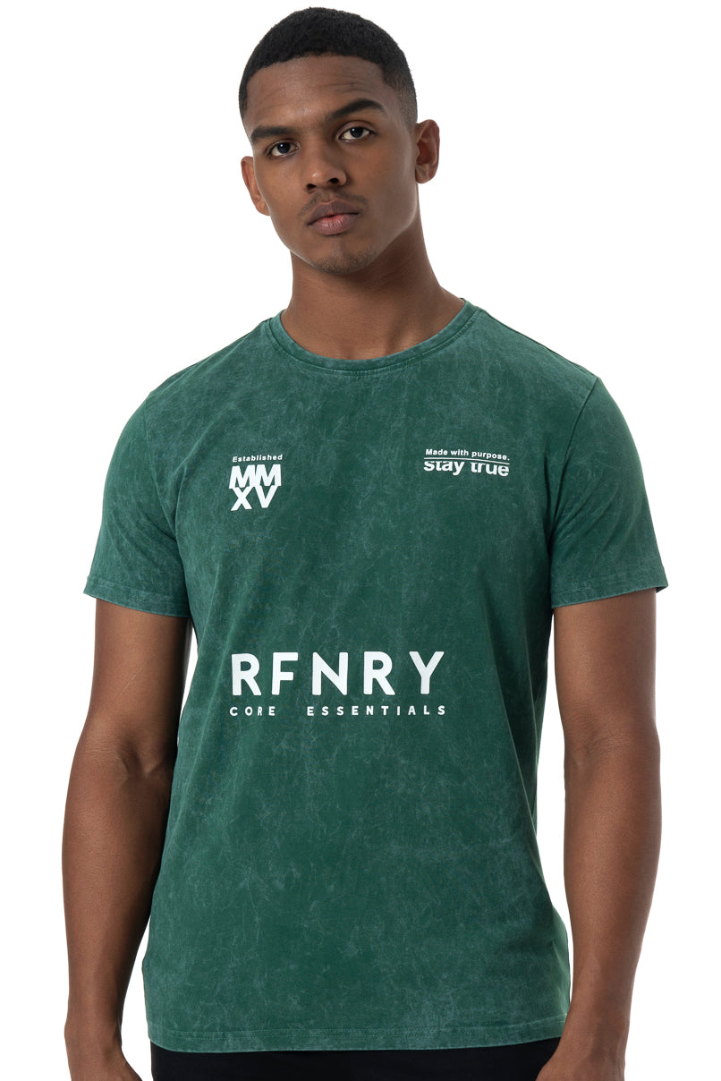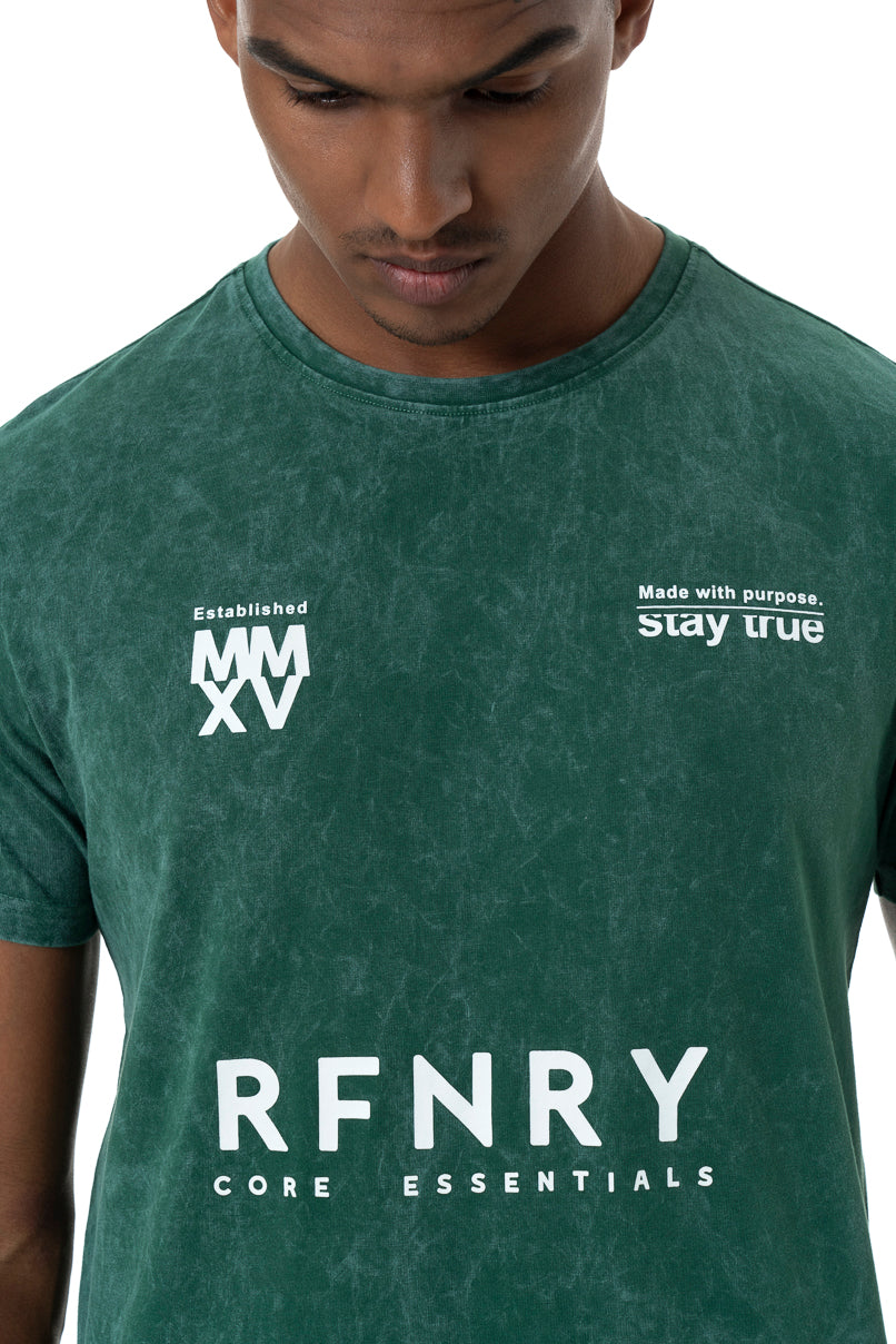 Green acid wash crew neck t-shirt with branded chest print.