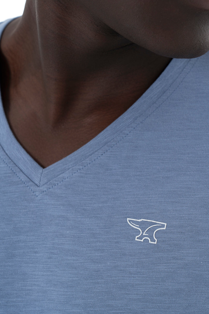 Blue V neck slub tee with high-density chest print