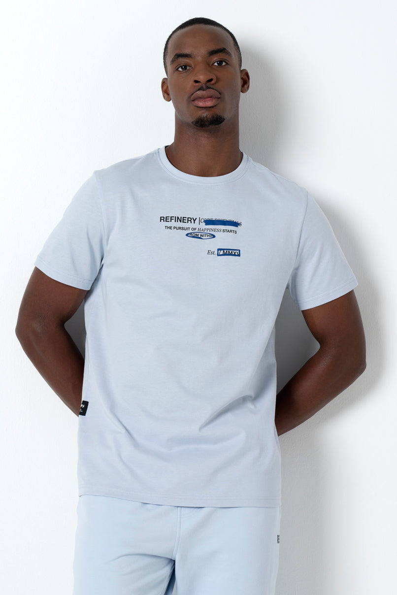 Light blue crew neck tee with branded print