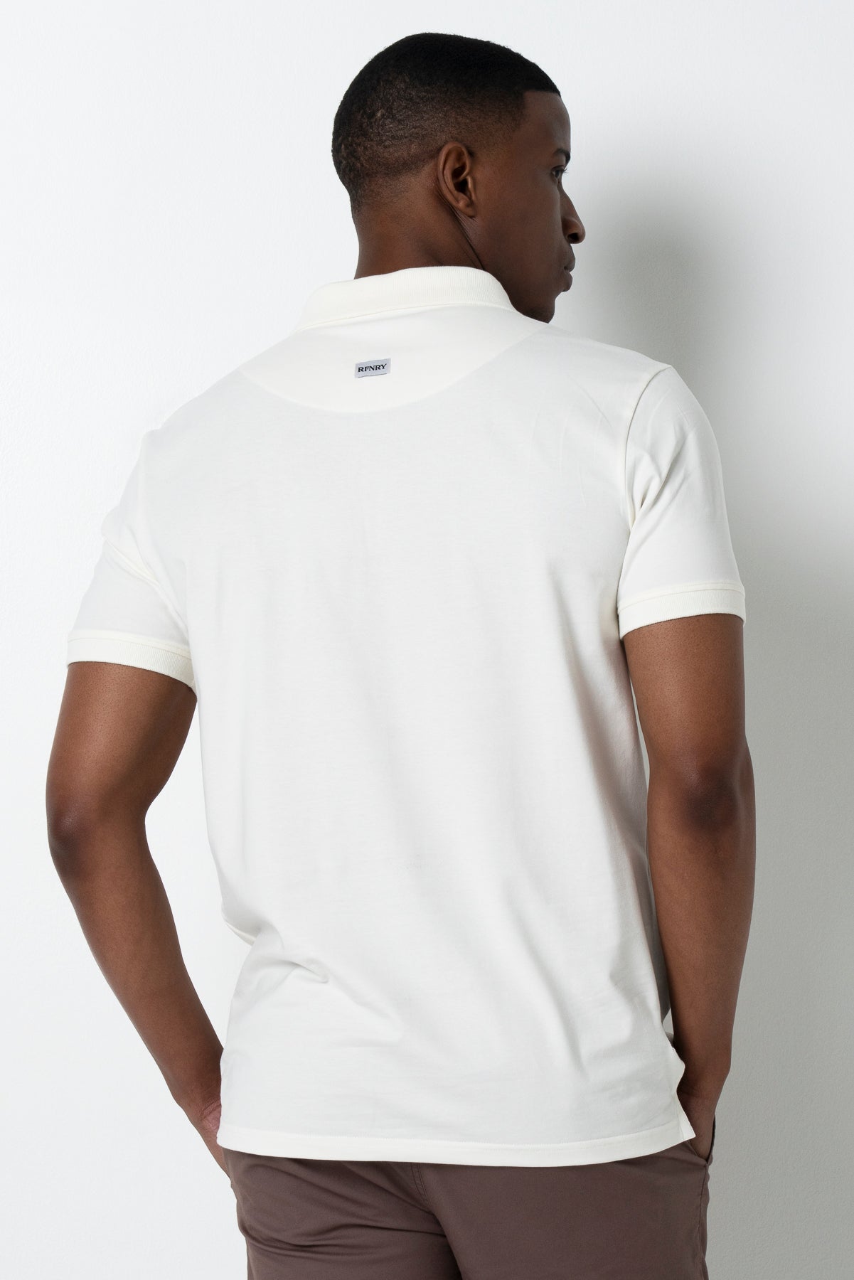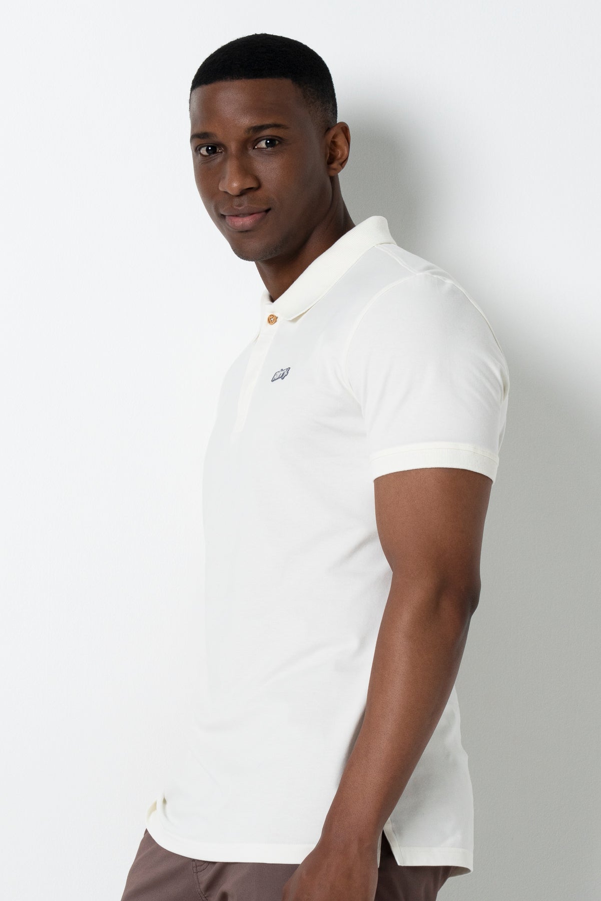 Off white single jersey golfer with branded wooden buttons. The golfer has a branding application and special branded internal trims.