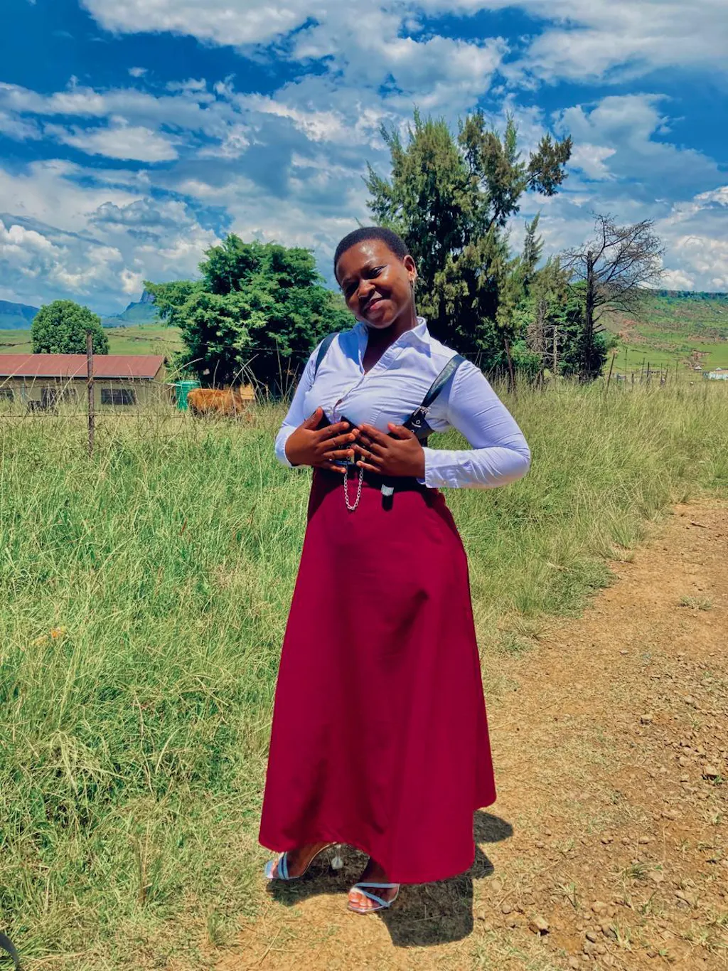 The burgundy PV flare skirt features a straight, relaxed body fit with back darts for subtle shaping and a side zip for easy wear. Falling to a mid-calf length with a straight hem, it offers a versatile and flattering silhouette. Made from a durable blend of 75% polyester, 20% viscose, and 5% elastane, the skirt combines structure with a slight stretch for comfort.