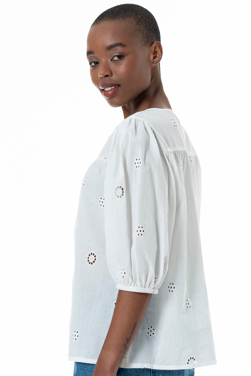 White cotton anglaise top with quarter sleeves.