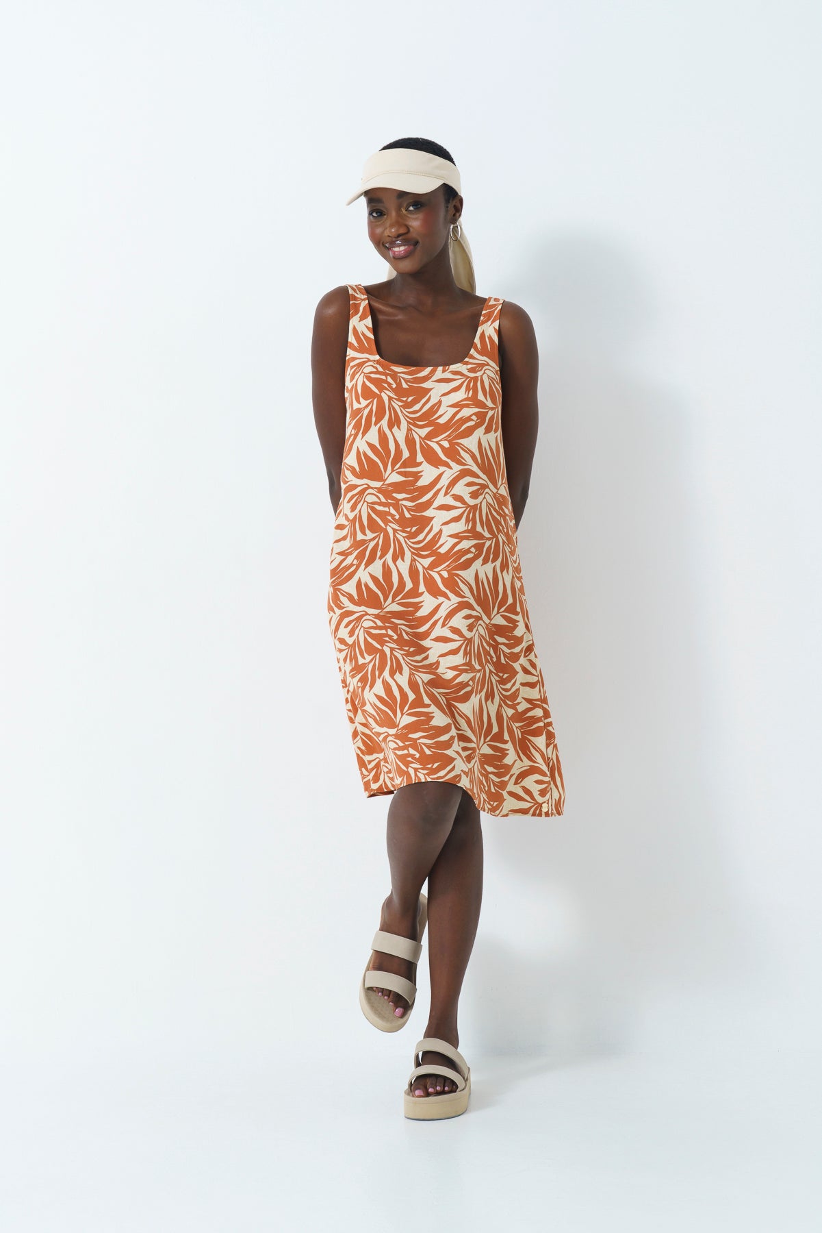 Tan printed baby doll dress with rounded square neckline.