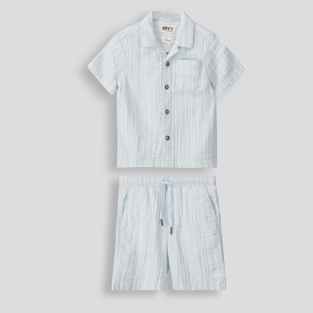 Pale blue striped double cloth textured pull-on shorts. This pull-on short has an elasticated drawstring waistband and is super