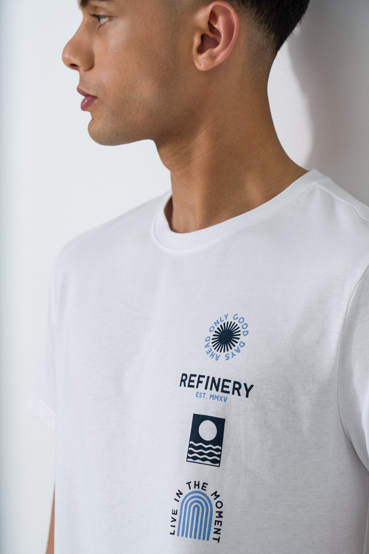 White crew neck tee with branded chest print. Regular fit with a ribbed crew neckline, short sleeves, and a straight hem. Made from 100% cotton.