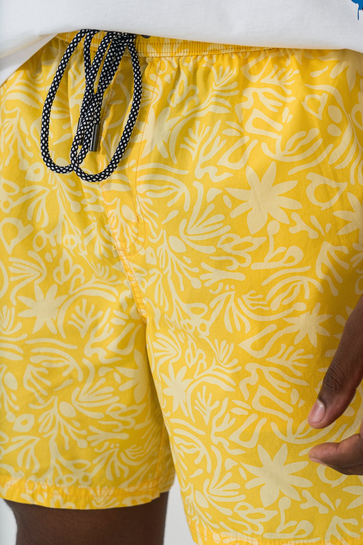 The yellow abstract printed pool short is your perfect poolside essential. It has an elastic waistband that makes it easy to wear and comfortable.